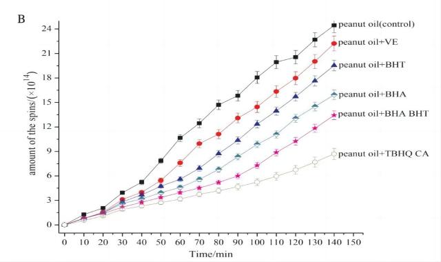 This study compares the effects of different antioxidants on the EPR signal intensity of peanut oil. Various antioxidants were added to the oil, including VE, BHT, BHA, a combination of BHA + BHT, and a combination of TBHQ + CA. As shown in the Figure, the Y-axis represents the spin concentration. Samples with added antioxidants show significantly lower spin signals compared to the control (peanut oil control, black line). This indicates that antioxidants effectively reduce free radical formation during oil oxidation.