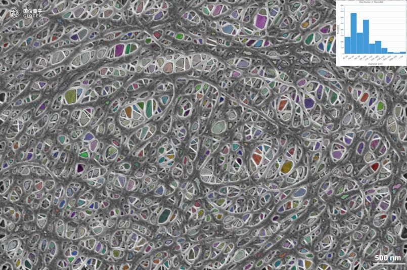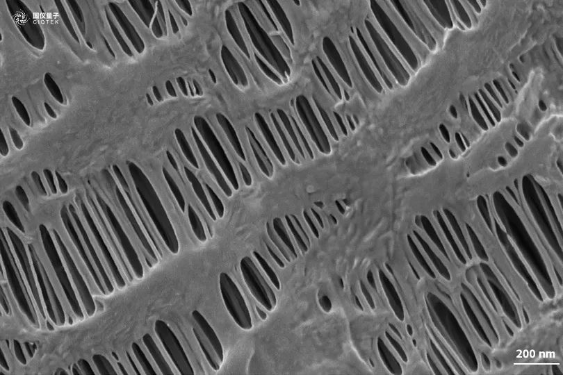The use of scanning electron microscopy can observe the pore size and distribution uniformity of the diaphragm, but also on the multi-layer and coated diaphragm cross-section to measure the thickness of the diaphragm. Conventional commercial diaphragm materials are mostly microporous films prepared from polyolefin materials, including polyethylene (PE), polypropylene (PP) single-layer films, and PP/PE/PP three-layer composite films. Polyolefin polymer materials are insulating and non-conductive, and are very sensitive to electron beams, which can lead to charging effects when observed under high voltage, and the fine structure of polymer diaphragms can be damaged by electron beams. The SEM5000 field emission scanning electron microscope, which is independently developed by GSI, has the capability of low voltage and high resolution, and can directly observe the fine structure of the diaphragm surface at low voltage without damaging the diaphragm.