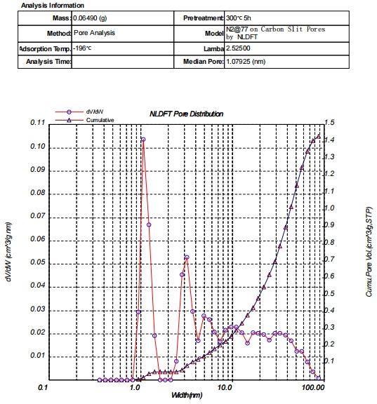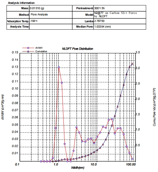 Because graphene and carbon nanotubes contain more holes so the specific surface area is larger, resulting in its surface energy is also higher, easy to cause agglomeration, thus need to analyse its pore size test. Using CIQTEK's own EASY-V series of specific surface and pore size analyser test results are shown below (Figure 4 and Figure 5), through the nitrogen adsorption and desorption isotherms can be seen, the two are mainly for the Ⅳ isotherms, the partial pressure ratio of P/P0 in 0.4 after the adsorption and detachment did not completely overlap, which means that hysteresis loops are generated, indicating that there is a certain degree of mesoporous structure. The NLDFT-pore analysis shows that both materials have relatively abundant pore size distributions at 1 nm and from 3 nm to 50 nm, and their total pore volumes are 1.43 cm3/g and 3.16 cm3/g, respectively.