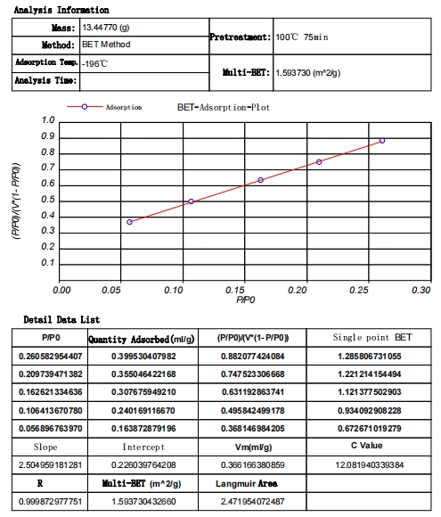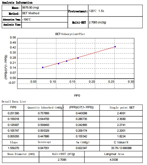 Copper powder and silver powder as a common and important conductive paste, its sintered film resistance, adhesion and densification and other important parameters to a certain extent depends on its particle morphology, dispersion, particle size and specific surface area properties. Professor Lv Ming found that the smaller the particle size, the larger the specific surface area and thus the larger the specific surface energy, and the lower the melting point, which is conducive to the solidification of nanosilver powders in silver pastes at lower sintering temperatures, and can be used in certain temperature-sensitive scenarios. CIQTEK's EASY-V series of specific surface area testers were used to determine the specific surface area of copper and silver powders, and the results were 2.71m2/g and 1.59m2/g, respectively (Figs. 1 and 2), with the P/P0 selection points ranging from 0.05 to 0.30, the linear fit>0.999, and the intercepts were all positive, which indicated that the test results were accurate and reliable, and that the instrument was highly automated, simple and convenient to operate, and had a high testing efficiency. It is easy and convenient to operate, and the testing efficiency is high.