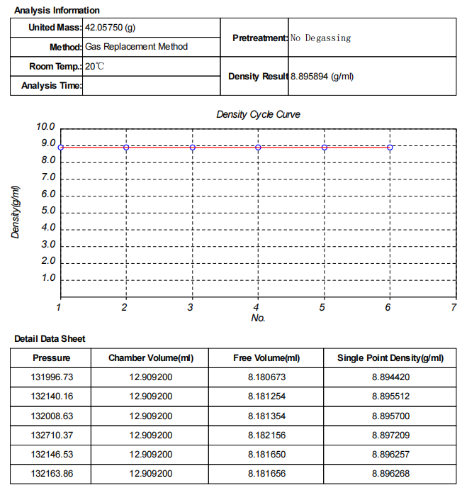 Conductive phase of the physical indicators will affect the performance of the conductive paste, such as silver powder true density, sintering is not easy to form holes, high densities, can get dense conductive excellent conductive film layer. CIQTEK self-developed EASY-G series of true density tester for the determination of the true density of silver powder, as shown in Figure 6, the true density of 8.896 g / ml, many times the test value is only in the third decimal point fluctuations, high test accuracy, and the instrument is equipped with three different specifications of the sample cell to meet the needs of different shapes of the sample volume test.