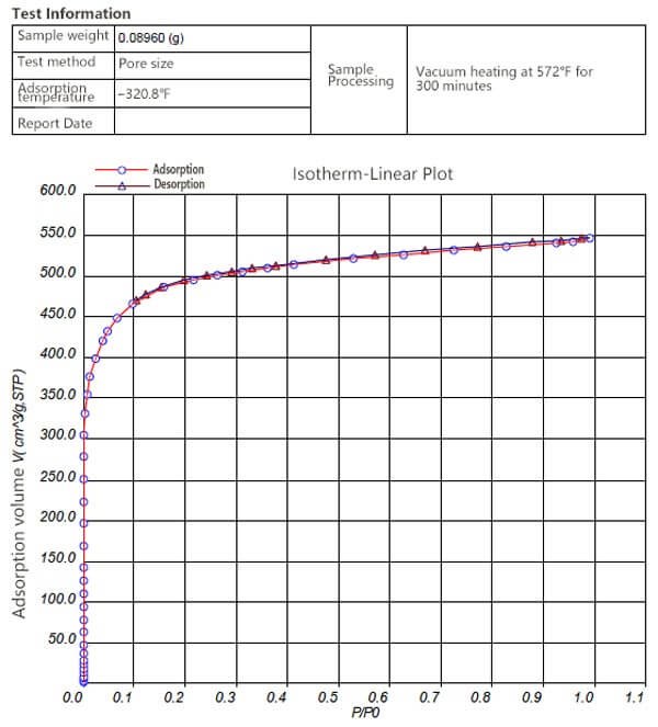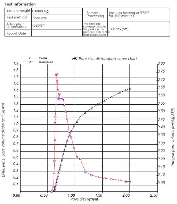 Combined with the analysis of the pore size distribution diagram, the HK - pore size distribution in Figure 3 shows a more concentrated distribution of one micropore pore size near 0.66 nm, indicating that its most countable pore size is 0.66 nm.
