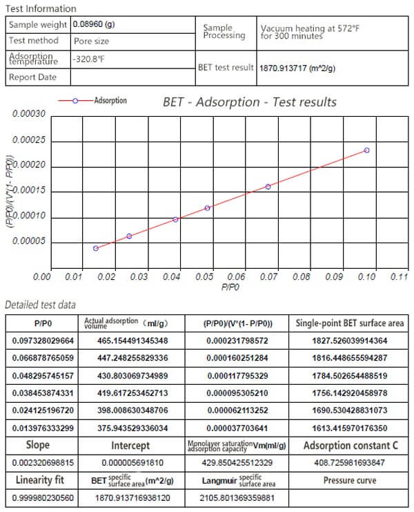 Figure 1 demonstrates that the specific surface area of the BET for porous carbon materials is 1870 m2/g. For microporous materials, the adsorption of nitrogen is closer to monolayer saturation adsorption, and the specific surface area of Langmuir is generally looked at and shown to be 2105 m2/g.
