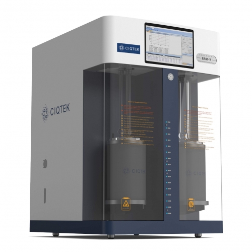 EASY-V 3440 is the BET specific surface area and pore size analysis instrument developed independently by CIQTEK, using the static volumetric method. ▪ Specific surface area testing, range 0.0005 (m2/g) and above. ▪ Pore size analysis: 0.35 nm-2 nm (micropore), micropore size distribution analysis; 2 nm-500 nm (mesopore or macropore). ▪ Four analysis stations, simultaneous testing of 4 samples. ▪ Equipped with the molecular pump.
