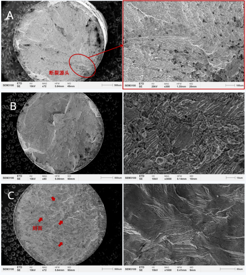 The experimental basis of fracture analysis is the direct observation and analysis of the macroscopic morphological and microstructural characteristics of the fracture surface. In many cases, the nature of the fracture, the location of the initiation and the crack extension path can be determined using macroscopic observation, but for a detailed study near the fracture source to analyze the cause of the fracture and the fracture mechanism, microscopic observation is necessary, and because the fracture is an uneven and rough surface, the microscope used to observe the fracture should have the maximum depth of field, the widest possible magnification range and high resolution . Combining these needs, SEM is widely used in the field of fracture analysis. Figure 1 three tensile fracture samples, through low magnification macroscopic observation and high magnification microstructure observation, sample A fracture is a river pattern (Figure A) for typical brittle fracture characteristics; sample B macroscopic no fibrous morphology (Figure B), microstructure no tough nests appear, for brittle fracture; sample C macroscopic fracture consists of glossy facets, so the above tensile fracture are brittle fracture.