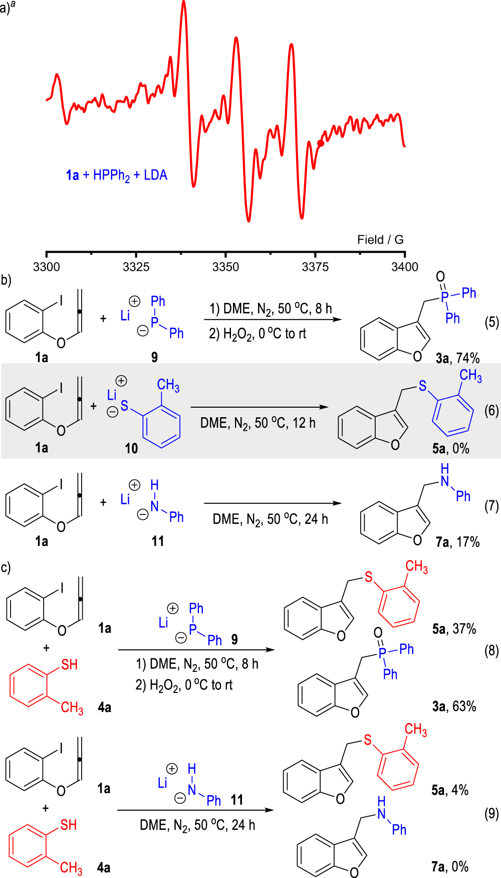 The generation of free radical species in the reaction system was confirmed in the study using EPR technique (CIQTEK EPR200-Plus). The EPR spectra of the mixture of 1a, HPPh2 and LDA in 25°C DME showed a signal similar to the phenyl g factor at g = 2.0023.