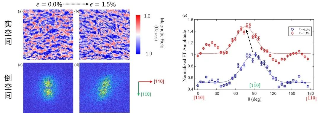 Figure 1. (a), (b) Real-space scanning magnetic imaging results of the BFO in the free state and at 1.5% strain. (c), (d) Fourier transform results of the scanned imaging data. (e) Statistical results of the angular distribution of the Fourier transform results in the free state and 1.5% strain state showing 12.6° of torsion.