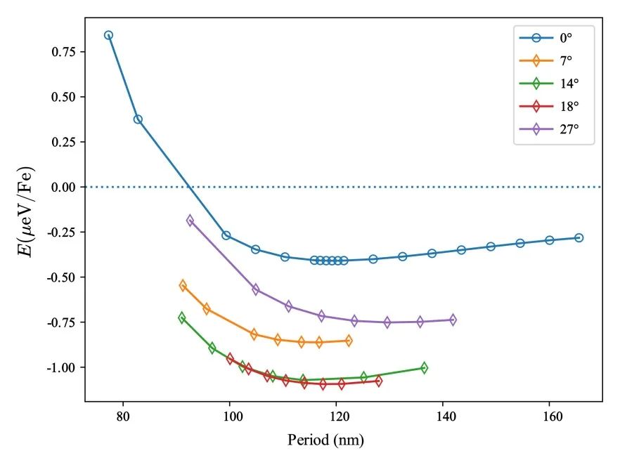 Fig. 2. The energy-pendulum line sequence period relationship curve calculated by the first nature principle. The calculated results for the pendulum line sequence direction parallel to the crystal direction are shown in blue curves, and the energy curves for the angles of 7°, 14°, 18° and 27° with the crystal direction are shown in different colors, respectively, see the legend. The calculation results show that the pendulum line order deviating from 14~18° is more stable.