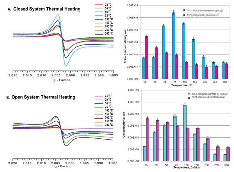 Petroleum processing, storage, transportation, and possible leakage from storage tanks are all susceptible to soil contamination. Although thermal treatment techniques can be used to remediate soils contaminated by various volatile, semi-volatile, pesticides and pentachlorophenol (PCP) , heating may alter soil physicochemical properties. The effect of low-temperature thermal treatment on PCPs and EPFRs in soils can be studied using EPR techniques.