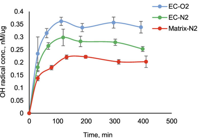 Tobacco smoke is an aerosol composed of particles/droplets (TPM, total particulate matter) and gas-phase chemicals (toxic gases, volatile organic compounds, short-lived radicals, etc.) TPM contains high concentrations of long-lived EPFRs, stable radicals that cause DNA damage through the formation of hydroxyl radicals (-OH), resulting in long-term negative effects on human health.