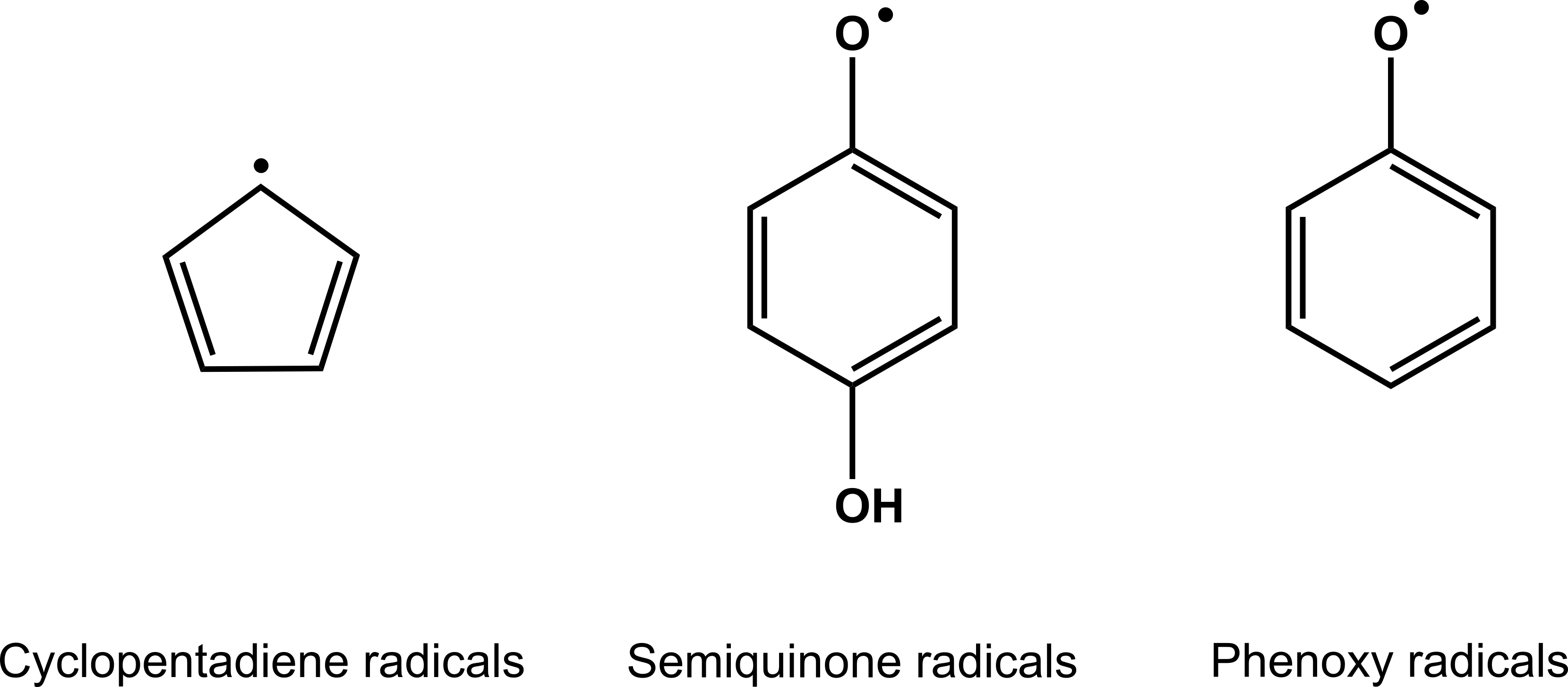 The conventionally recognized free radicals are often transient with a short lifetime. On the contrary, EPFRs can be stable in the environment for tens of minutes to tens of days without being oxidized or quenched. The commonly found EPFRs include, cyclopentadienyl, semiquinone, phenoxy, and other radicals.