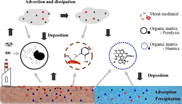 EPFRs are found in a wide range of environmental media, such as atmospheric particulate matter (e.g. PM 2.5), factory emissions, tobacco, petroleum coke, wood and plastic, coal combustion particulates, soluble fractions in water bodies, and organically contaminated soils, etc. EPFRs have a wide range of transport pathways in environmental media and can be transported through vertical ascent, horizontal transport, vertical deposition to water bodies, vertical deposition to land, and landward migration of water bodies. In the process of migration, new reactive radicals may be generated, which directly affects the environment and are precursors to other pollutants.