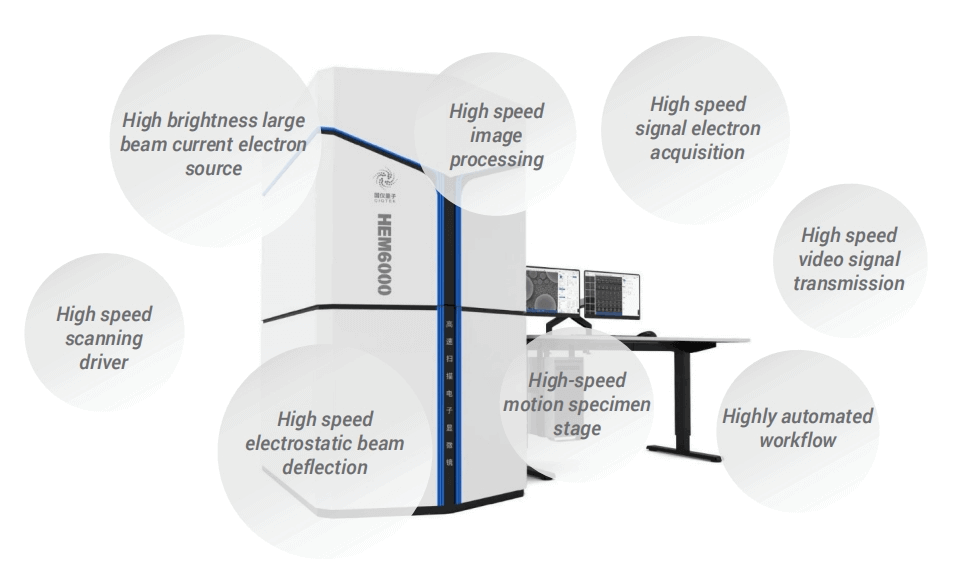 CIQTEK HEM6000 facilities technologies such as the high-brightness large-beam current electron gun, high-speed electron beam deflection system, high-voltage sample stage deceleration, dynamic optical axis, and immersion electromagnetic & electrostatic combo objective lens to achieve high-speed image acquisition whilst ensuring nano-scale resolution.