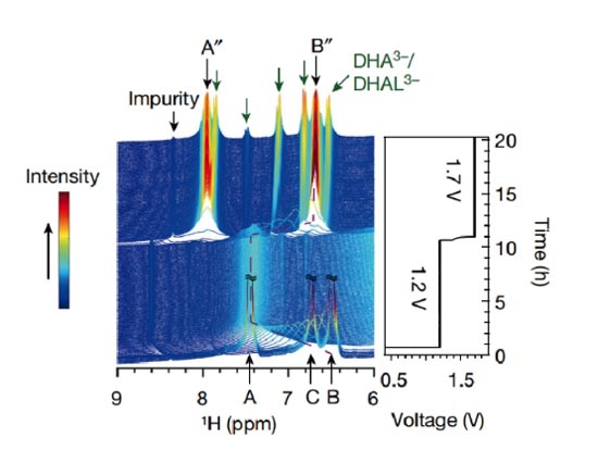 Research on redox flow batteries requires fundamental insight at the molecular level to improve performance. By applying in situ nuclear magnetic resonance (NMR) methods to the electrolyte, electrolyte decomposition and battery self-discharge can be explored in real-time.