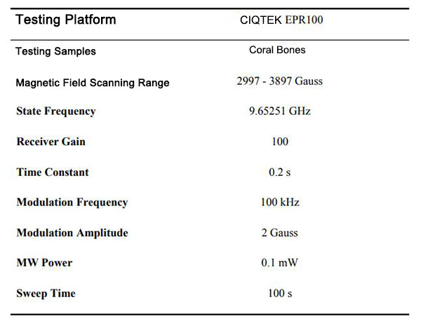 The sample was taken from white coral in the South China Sea, treated with 0.1 mol/L dilute hydrochloric acid, crushed with a mortar, sieved, dried at 60°C, weighed about 70 mg, and tested on the CIQTEK EPR100.