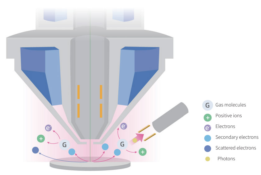 The secondary electron emission from the sample surface ionizes air molecules, generating electrons, ions, and photo signals simultaneously. The generated electrons then ionize other air molecules and a large number of photo signals are produced and then captured by a Low Vacuum Detector (LVD).