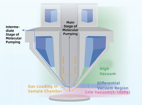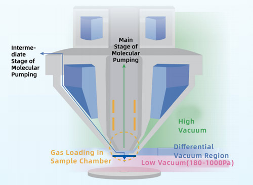 The incident electron beam ionizes the air molecules on top of the surface, producing electrons and ions, in which ions neutralize the charged particles generated on the sample surface, achieving the effect of charge mitigation.